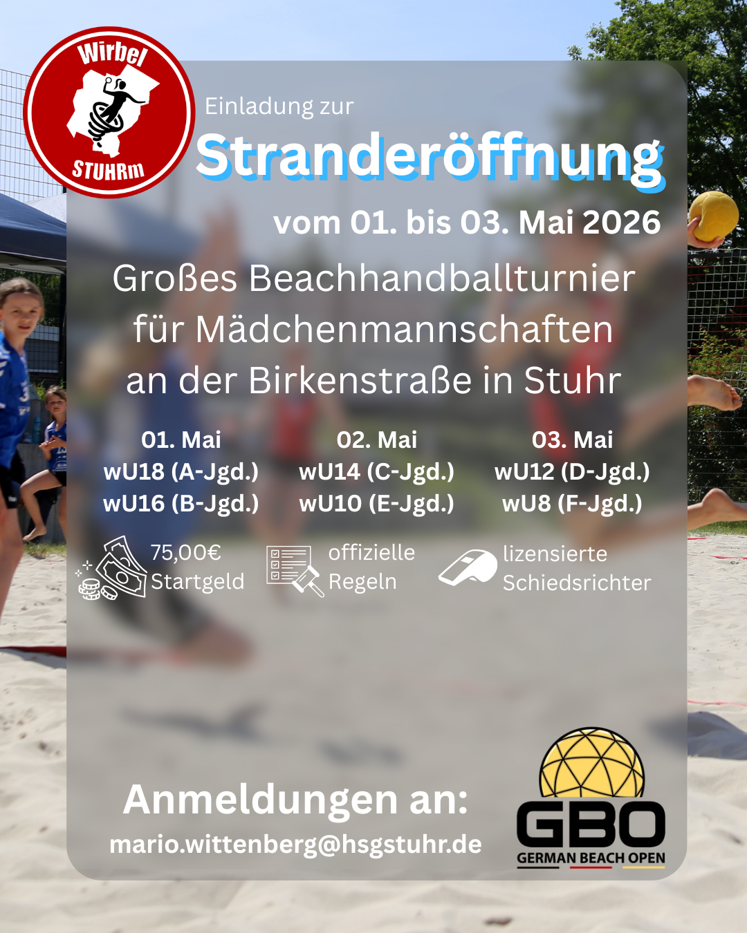 Zum Auftakt der Sommersaison veranstalten wir zum dritten Mal unser großes Beachhandballturnier für Mädchenmannschaften der Altersklassen wU8 bis wU18. Von Freitag bis Sonntag fliegt der Ball über den sommerlichen Sand mit der Hoffnung auf Sonne pur zum Beginn der Beachsaison. Die Altersklassen wU18, wU16 und wU14 sind Teil der GBO-Tour und sammeln Punkte für die Qualifikation zur Deutschen Jugendmeisterschaft. Gespielt wird nach internationalen Regeln. Altersentsprechede Anpassungen für die wU10 und wU9 können der Ausschreibung entnommen werden. Geleitet werden die Spiele von erfahrenen Beachhandballschiedsrichterinnen und -Schiedsrichtern. Seid mit euren Mannschaften dabei und genießt ein Beachhandballevent der Extraklasse zum Saisonbeginn!